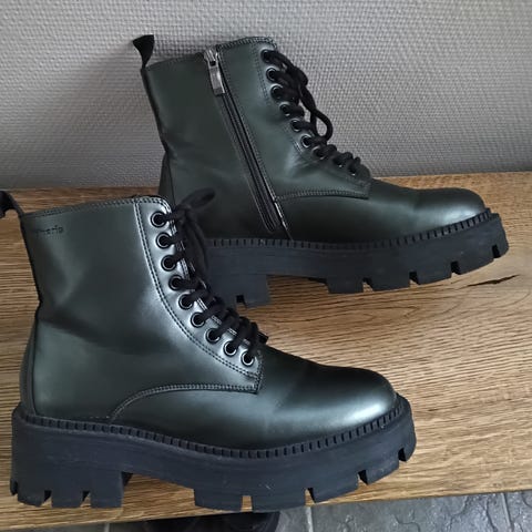 Tummanruskeat Tamaris-nilkkurit, joiden päällinen on nahkaa. Kengissä on korkea lohkokorko sekä reilusti uritettu ulkopohja. Ulkosivulla oleva koristeellinen vetoketju metallisella vetimellä antaa niille viimeistellyn ilmeen.Koko EUR 40 (US 6, CM 24)Koron korkeus: noin 9 cmValmistaja: TamarisVäri: tummanruskeaMateriaali: nahka, synteettinen materiaali