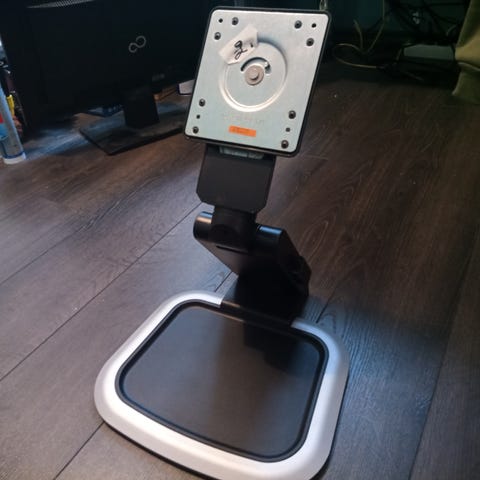Näytönjalka. Kiinnitys 100mm reikävälillä. Korkeussäätö, kallistus ja näytön kääntö.