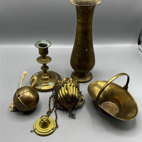 Erilaisia messinki esineitä mm. Sydämenmuotoinen messinkirasia, joka on valmistettu vintage-tyyliin. Tämä rasia on suunniteltu säilyttämään pieniä esineitä, kuten koruja tai muita arvotavaroita. Kaksi maustemyllyä sekä pieni naulakko seinälle. Esineissä näkyvissä kulumisen merkkejä, kuten naarmuja ja pieniä kolhuja, jotka kertovat sen iästä ja käytöstä. Messingin patina lisää esineen luonnetta, mutta se saattaa vaatia puhdistusta kiillon palauttamiseksi.
