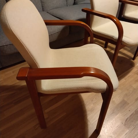 Tyylikäs Ikea Vedbo nojatuoli, jossa on harmaa kangasverhoilu ja puurunko. Tämä tuoli tarjoaa mukavan istumakokemuksen ja on erinomainen lisä mihin tahansa olohuoneeseen tai lukunurkkaan. Tuolissa on havaittavissa vähäistä kulumaa. Kangas on säilynyt siistinä, ja puuosat ovat tukevat. Istuimen alta puuttuu 2 tukipulttia, mutta istuintuntuma silti tukeva - huomioitu hinnassa.