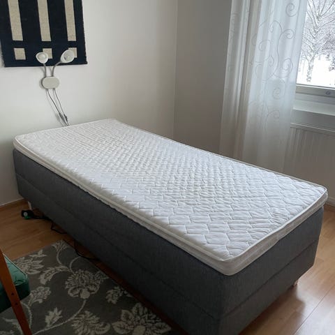 Uusi käyttämätön kotimainen moottorisänky. Väri vaaleanharmaa, kovuus keskikova. Kahdella moottorilla, molemmat päädyt nousee. Petauspatja vielä avaamattomassa tehtaan paketissa.
