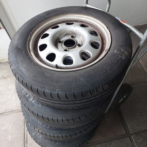 Ylimääräiset 4 kpl renkaat peltivanteillaan pois varastosta tilaa viemästä. Vanteet suorat, pölyiset. Renkaissa pintaa hyvin.