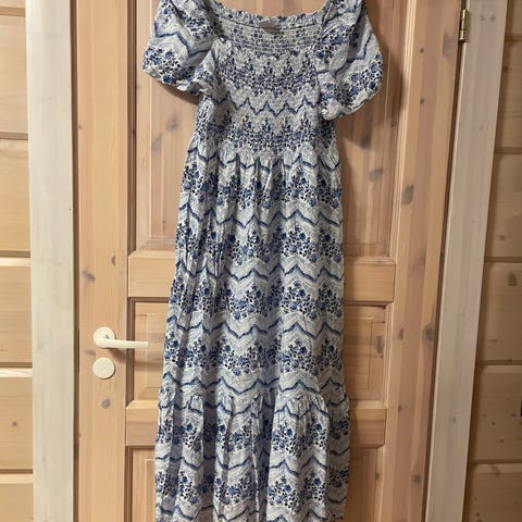 Polan kesämekko naisille, koko L. Materiaalina viskoosi. Mekko on beige ja siinä on kauttaaltaan kukkakuviointi sinisen ja violetin sävyissä. Pitkät hihat.