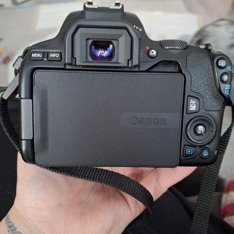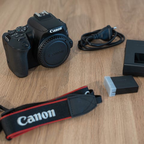 Mukaan laturi, yksi akku ja 18-55 linssi.