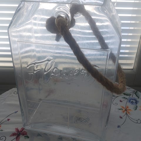 Riviera Maison Flower Bag Vase lasimaljakko. Muuten hyvässä kunnossa, mutta yksi pieni viiru/halkeama lasin sisällä, tämä ollut jo ostettaessa. Ei vaikuta käyttöön.