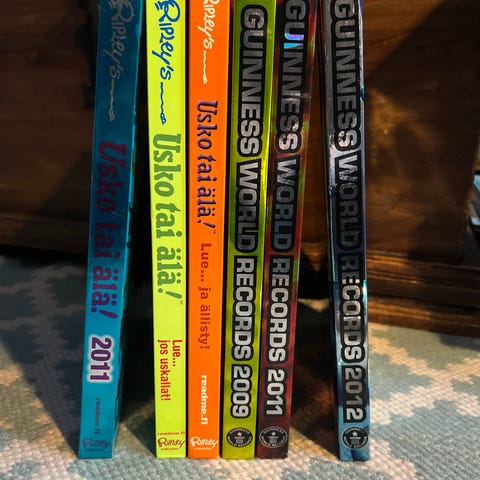 Ripley’s Believe It or Not! 2013 -kirja, suomenkielinen painos. Kovakantinen tietokirja, joka sisältää kokoelman erikoisia ja yllättäviä faktoja, ilmiöitä ja ennätyksiä eri puolilta maailmaa.