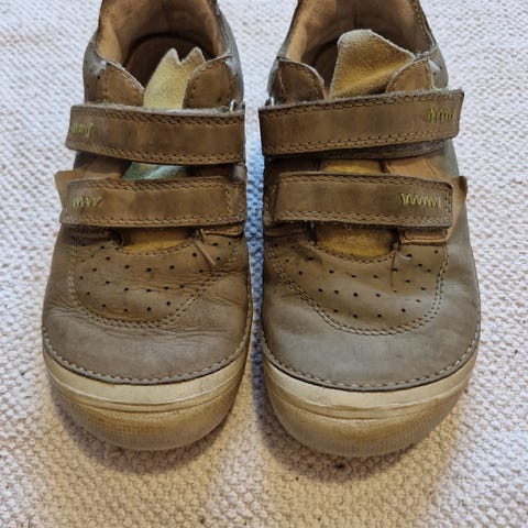 Nahkaiset paljasjalkakengät. Saisi lankilla siistittyä, mutta se jää ostajalle. Toisessa kengässä ommel auennut (kuva 2). Irrotettava pohjallinen. Yhden lapsen, yhden syksyn käyttämät, mutta käytössä kuluneet.