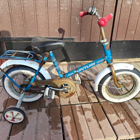 Lasten polkupyörä 12" renkailla. Käsijarru rikki, mutta ei vielä tämän ikäisellä ollut käytössä. Jalkajarrut ok. Työntöaisa mukaan erikseen.