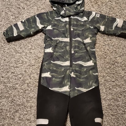 Remu talvihaalari lapselle, koko 104. Vihreäpohjainen kuosillinen yläosa ja yksivärinen vihreä alaosa. Haalarissa on huppu, etuvetoketju ja joustoresori vyötäröllä. Lahkeissa on vahvikkeet ja heijastinyksityiskohtia. Unisex-malli, sopii sekä tytöille että pojille arki- ja ulkoilukäyttöön. Käytti 1 lapsi