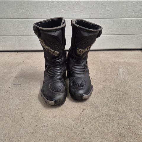 Oxtar TCX Comp moottoripyörä ajosaappaat. Koko EU 43. Väri musta, valkoisia ja ruskeita yksityiskohtia. Korkea varsi ja useita solkikiristyksiä jalan tukemiseen. Huom. toisessa kengässä ylin solkikiristys rikki. Muuten hyvä käytetty kunto.