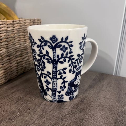 Iittala Taika muki punaisella pohjavärillä ja pöllökuvioinnilla. Muki on keraaminen ja siinä on korva. Pohjamerkintöjen mukaan muki kestää konepesun, mikroaaltouunin, pakastuksen ja uunin. Soveltuu arki- ja kahviastiastoon juomien, kuten kahvin, teen tai kaakaon tarjoiluun.