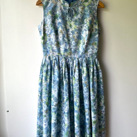 Myydään puuvillainen kukkamekko, jossa tyköistuva yläosa ja kellomainen helma. Lyhyet puhvimaiset hihat, takana vetoketju.