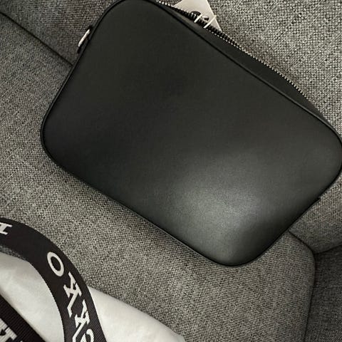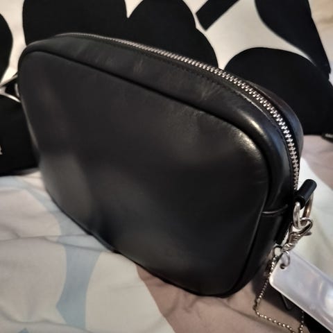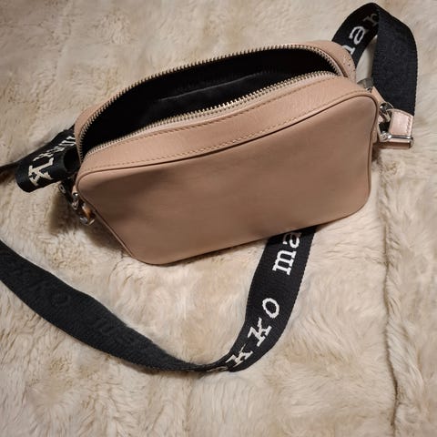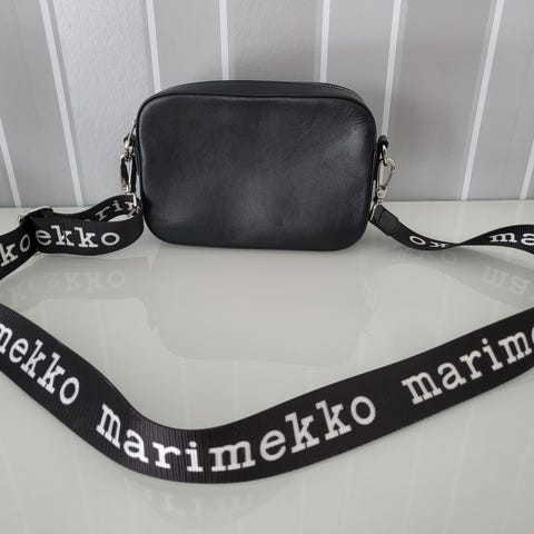 Marimekko nahkainen olkalaukku naisille. Laukku on mustaa nahkaa ja siinä on vetoketjusuljenta yläosassa. Mukana tulee säädettävä ja irrotettava olkahihna, jossa on Marimekko-logoteksti. Laukku sopii arkeen ja vapaa-aikaan pienten henkilökohtaisten tavaroiden, kuten puhelimen, lompakon ja avainten kuljettamiseen.