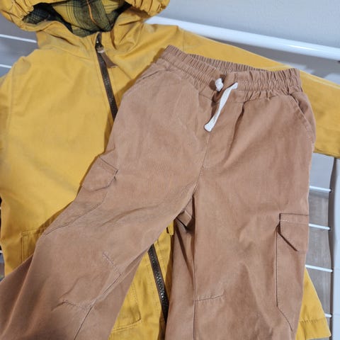 Reiman untuvatakki koko 98 ja Lassien toppahousut koko 104.