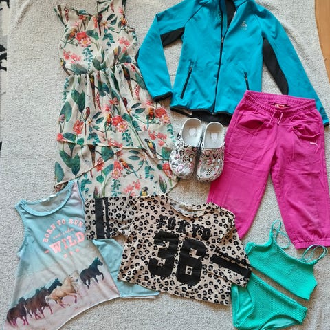 Myydään pakettina vaatetta kevääseen ja kesään. Koot 134, 134/140, yhdet 146 kesähousut.