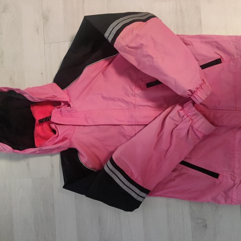 Lila 134/140 cm välikausitakki. Päällinen ohutta kangasta, alla vuorikangas. Taskut ja huppu. Painatukset. Pesty juuri, ehjä takki seuraavalle.