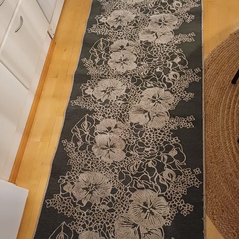 Ruskeahkolla pohjalla sydänkuviot.Hyvin pysyy paikallaan.Ei ole ollut lattialla.