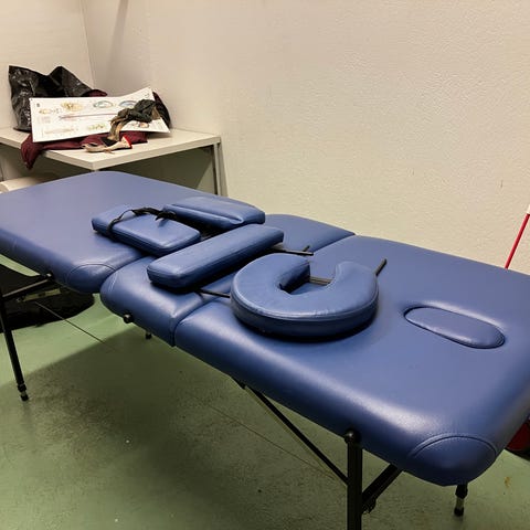 Väri valkoinen, verhoilu keinonahkaa. Pöydässä on manuaaliset säädöt ja se toimii moitteettomasti.
