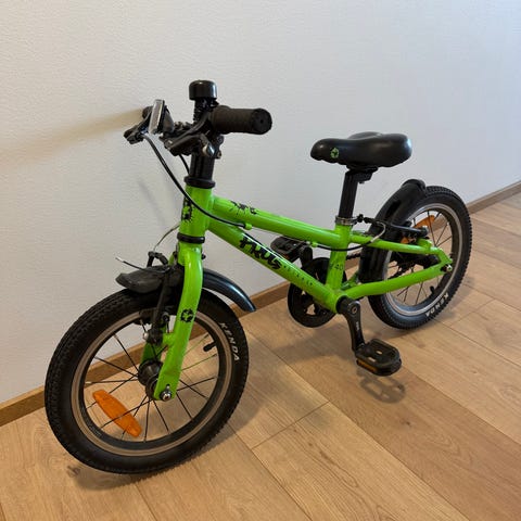 Islabikes Cnoc lasten polkupyörä, 14" renkailla.. Pyörässä on käsijarrut edessä ja takana, lokasuojat. Ei jalustaa.
