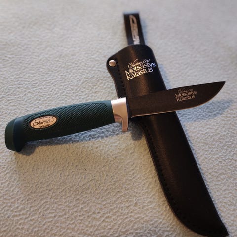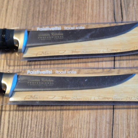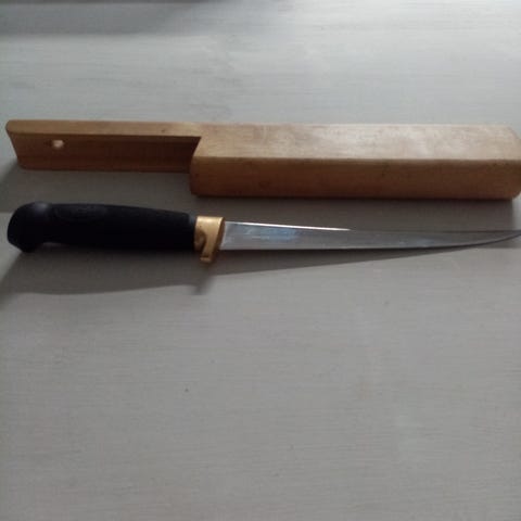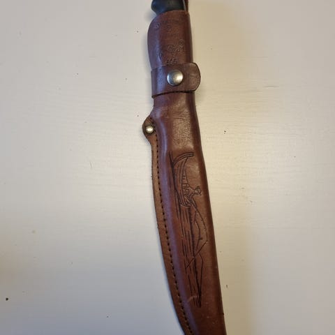 Käyttämätön, pituus 27cm, 15cm ruostumaton kromiteräs terä martef pinnoitteella, kahva kumiseosta, tuppi nahkaa