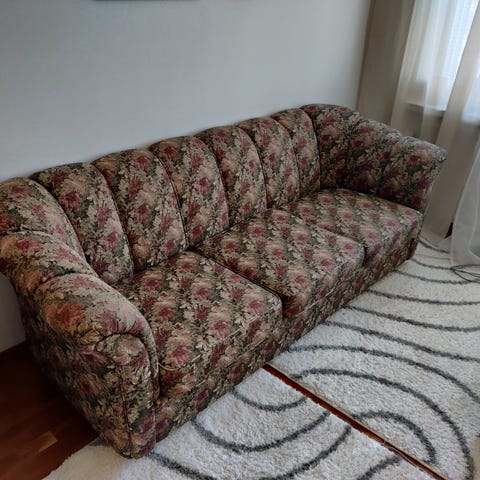 Todella nätti vintage sohva puisilla jaloilla. Palvellut erinomaisesti, mutta muuton myötä jäänyt tarpeettomaksi. Sohvatyynyssä on pari pientä tahraa jotka todennäköisesti lähtevät pesulla.