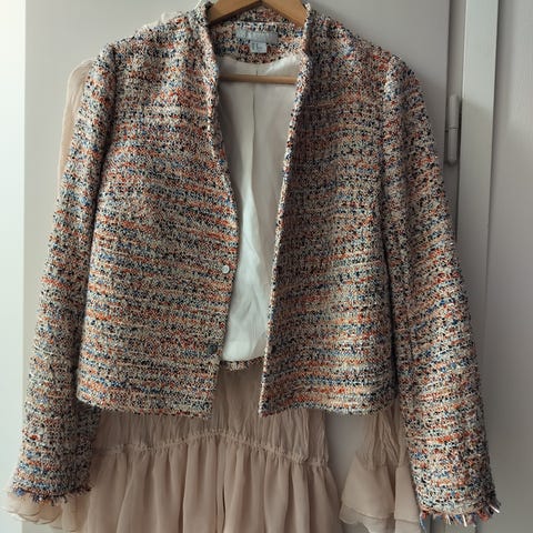 Myydään kuvan mukainen kaunis jakku. Yleisväri ruskea, ruskea kangas osin kiiltää valossa, lisäksi mustaa ja mustaa kirjailu. Isot mustat napit. Koko 44 - 46. Valitettavasti laput olen leikannut pois. Juhlakäytössä ollut. Hajusteettomalla pesuaineella pesty. Tyköistuvat leikkaukset, jotka kuitenkin loivat, ei "kurvikkaat" . Takana helmassa pieni koristerypytys. Selän pituus 61 cm, selän lev 61 cm kainalossa hihan alla, hihan piti 62 cm. Nouto Nastonharju tai sovitusti Riihelä. Käteinen tai mobilepay. Postitan matkahuollon pakettina kulut 7 e . Katso myös muut ilmoitukseni, samaan pakettiin muuta.