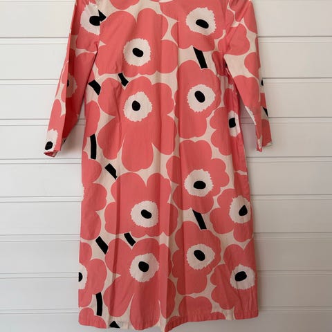 Myydään vain sovitettu Marimekon 'Sinililja Maisema Unikko' -mekko. Kaulukset, napit hiansuissa ja edessä, kiristysnauha vyötäröllä, taskut sivusaumoissa, pyöristetty helma, halkiot sivuilla.