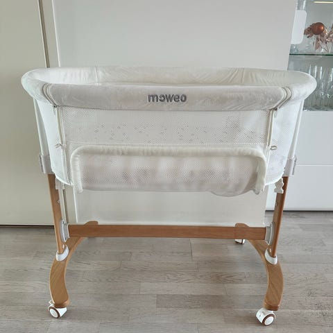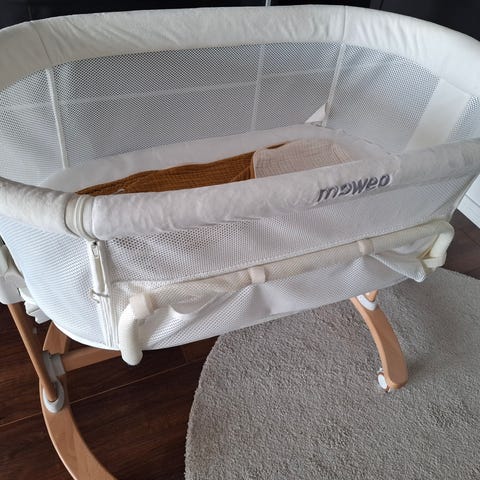 Moweo sivuvaunusänky vauvalle. Sänky kiinnitetään vanhemman sängyn viereen, jolloin vauva nukkuu omassa sängyssään mutta lähellä aikuista. Runko on metallinen ja jalat ovat leveät ja tukevat. Reunoissa on pehmustetut kankaat ja toisella sivulla verkkokangas, josta vauva näkyy hyvin. Sängyn korkeutta voi säätää, jotta se saadaan samalle tasolle aikuisten sängyn kanssa. Mukana tulee patja sekä kantokassi säilytystä ja kuljettamista varten. Ohjekirja tallessa.
