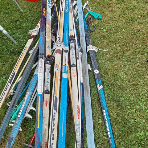 Vanhat sukset, sauvat ja monot. Monojen koko 36. Sukset vanhanaikaisilla siteillä.