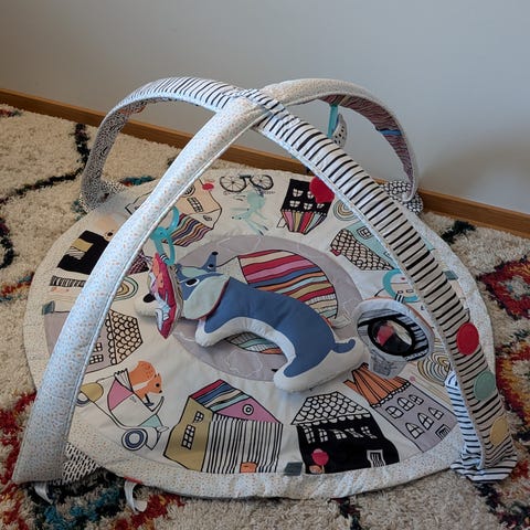 Leikkimattoon kuuluu pehmeä matto, yhteensopiva tyyny, kuvioidut kaaret, peili sekä viisi kaariin kiinnitettävää lelua