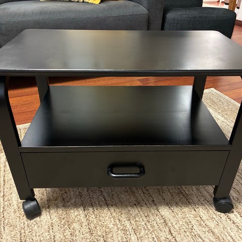 Musta metallinen tv-taso pyörillä.