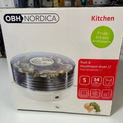 OBH Nordica Fruit & Mushroom Dryer hedelmä- ja sienikuivuri. Sähköinen kuivuri hedelmien, vihannesten, yrttien ja sienien kuivaamiseen. Laitteessa on useita päällekkäisiä kuivaustasoja, joiden läpi lämmin ilma kiertää ja kuivaa raaka-aineet tasaisesti. Soveltuu kotitalouskäyttöön elintarvikkeiden säilöntään ja kuivaamiseen. Kuivurin etuosassa on virtakytkin ja merkkivalo. Tyyppi 6775.
