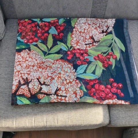 Vallilan valmisverhot, koko 140 x 240 cm, kankaana Tanja Orsjoki Pihapiiri