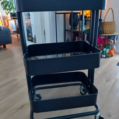 Musta Ikean rödeby tarjotin sohvan käsinojalle. On jo kolhua ja naarmua jonkun verran ja väleissä kulumaa, mutta toimiva ja ehjä edelleen.