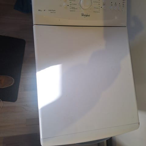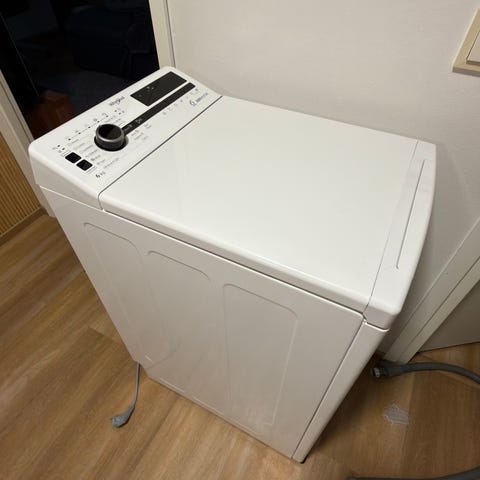 Whirlpool päältä täytettävä pesukone. Zen-teknologia (suoraveto). 6.5 kg pyykkiä ja linko 1200 rpm.