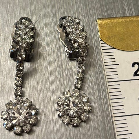 Kolme paria ajattoman klassisia korvakoruja. Suuremmat strassikorvakorut 1980-1990-luvulta. Hintaan kuuluuvat kaikki kolme paria.