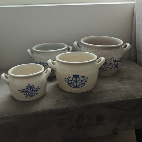 Arabia keramiikkaruukku, jossa kaksi vastakkaista kahvaa ja sininen kukkakoriste kyljessä. Ruukku on vaaleaa, lasitettua keramiikkaa ja sisäpinta on sileä. Pohjassa on Arabialle tyypillinen leima, savupiippu. Mitat näkyvät kuvissa mittanauhan avulla. Sopii esimerkiksi keittiöastiana, säilytysastiana tai koriste-esineenä.