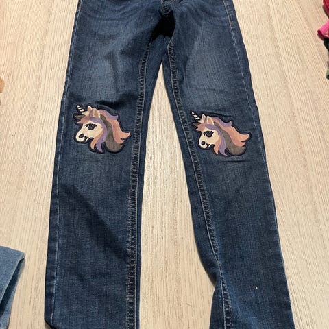 Lindex leveälahkeiset farkut, koko 128cm. Säädettävä vyötärö. Toisessa lahkeessa ommel purkautunut, muuten hyväkuntoiset.