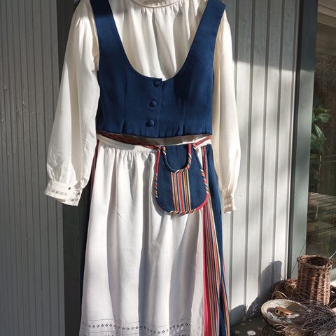 Kokonaisuus, jossa myös laattakoru mukana. Ei ole pesetetty , on säilytetty muodissa. Vyötärömitta n.80 cm.