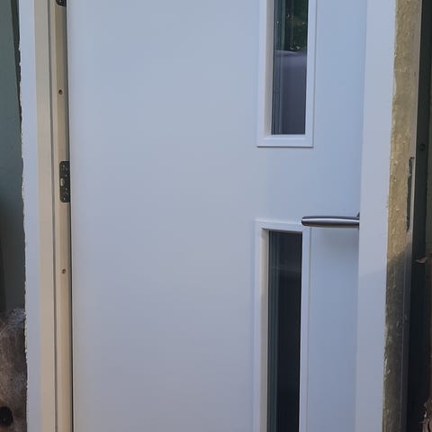 Varma ulko-ovi, leveys 870 mm ja korkeus 2070 mm. Ovi on ulkopuolelta harmaa (sävy RR22 taittaa siniseen) ja sisäpuolelta valkoinen, siinä on kapea pystysuuntainen lasiaukko, joka tuo valoa sisään. Sopii ulko-oveksi asuinrakennukseen tai muuhun tilaan, jossa tarvitaan erillinen sisäänkäynti. Kuvassa ovi ulkopuolelta katsottuna.