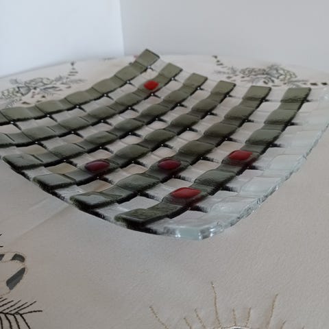 Upeat lasiset tarjoilulautaset lehti kuosilla. Käsinpesu.