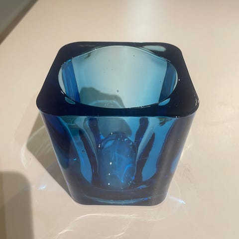 Pentik kynttilä sinisestä lasista. Korkea, sylinterinmuotoinen malli, jossa metalliset renkaat koristeena yläreunassa. Sopii esimerkiksi kukkamaljakoksi tai sisustusesineeksi. Mitat näkyvät kuvissa mittanauhan avulla.