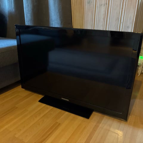 Samsung televisio musta. Taulutelevisio, jossa tasainen näyttöpaneeli ja virtajohto kiinteästi takana. Takapaneelissa useita liitäntöjä, kuten HDMI-, komponentti- ja komposiittiliitännät, SCART-liitäntä sekä antenniliitäntä. Sopii esimerkiksi olohuoneeseen tai makuuhuoneeseen peruskatseluun ja erilaisten laitteiden, kuten digiboksin tai pelikonsolin, liittämiseen. Televisiosta puuttuu oma jalka.