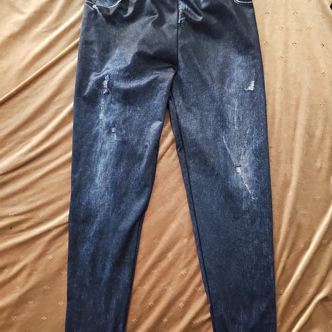 Farkkuleggingsit bling kuviolla. Talvi leggingsit. Sisällä fleece vuori. Joustava kangas. Ei kokolappua mutta venyy hyvin. 85% polyamidia ja 15% elastaania. Ovh 19e.