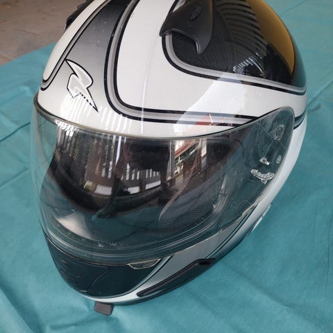 Kuvan kypärä, leukasuoja aukeava, visiiristä puuttuu toinen ruuvi