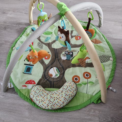 Skip Hop leikkimatto vauvalle. Pyöreä pehmeä matto, jossa ääni, -ja valotoiminto. Yksi roikkuva lelu kadonnut.