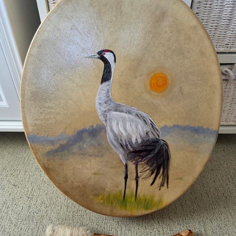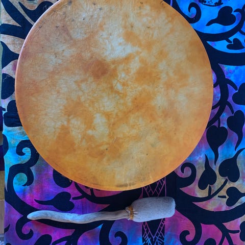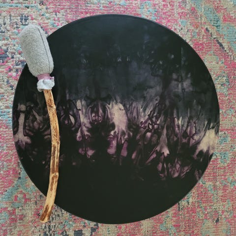 Rumpu-ukon kaunis, tummanvioletti M-koon shamaanirumpu, jossa kettua muistuttava kuvio. Mukaan huovutettu kapula. Pieni kauneusvirhe ollut alusta saakka alareunassa, kuitenkin ehjä eikä vaikuta ääneen.