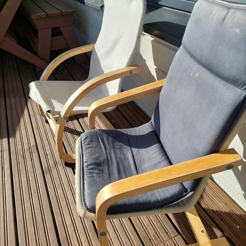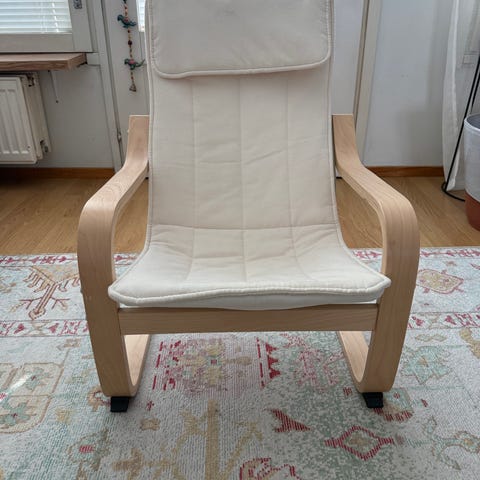 IKEA lasten nojatuoli, jossa kaarevarunkoinen puinen runko ja irrotettava pehmuste. Päällinen on vaalea ja siinä on monivärinen dinosauruskuosi. Päällinen vasta pesty