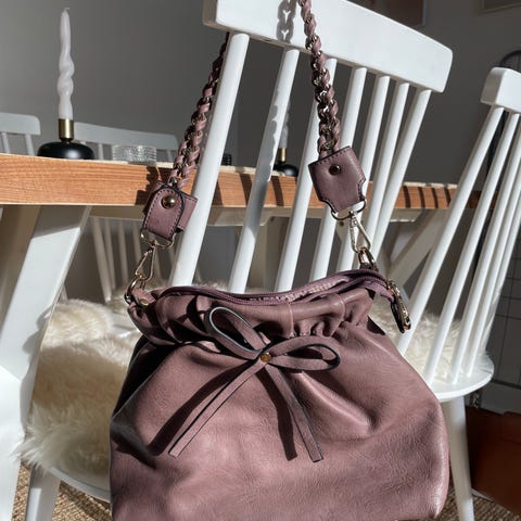 Kassissa on pyöreät rottinkiset kantokahvat ja koristeellinen yläosa, joka on viimeistelty helmillä, strasseilla ja hapsuilla. Laukun alaosa on valmistettu punotusta materiaalista, sisällä on vetoketjukiinnitys ja sisätaskuja.