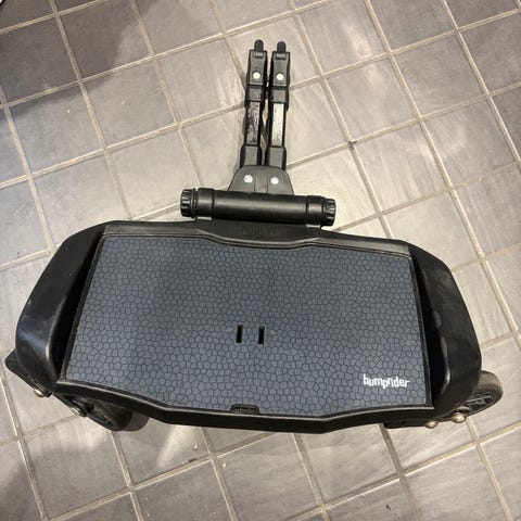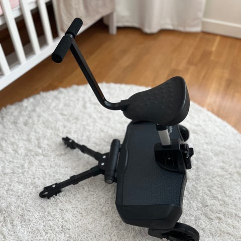 Hyväkuntoinen seisomalauta. Toimii kuten pitääkin, helppo kiinnittää rattaisiin. Erillinen nauha puuttuu millä pystyisi laittamaan ylös selkänojaan kun ei ole käytössä. Itse otimme laudan vaan pois ja laitoimme tavarakoriin kun ei käytetty. 😊